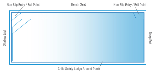 The Amalfi is one of Barrier Reef Pools’ newest pool ranges. Coming in five different sizes, you can be sure that you’ll find the perfect fit for your backyard space. The Amalfi comes with a non slip entry and exit steps, as well as a full length bench seat and a safety ledge around the pool for the younger kids. This pool is ideal for narrow backyards with a width of 2.8 metres, but you’ll still have plenty of space to swim and splash around in.