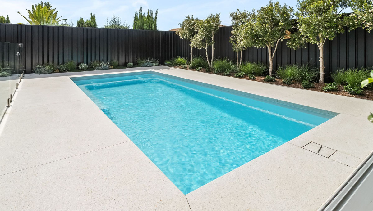 This expansive 8.6m x 4.4m Brooklyn pool in Hampton Grey Shimmer makes a bold statement in this Wembley backyard. With its clean lines and generous