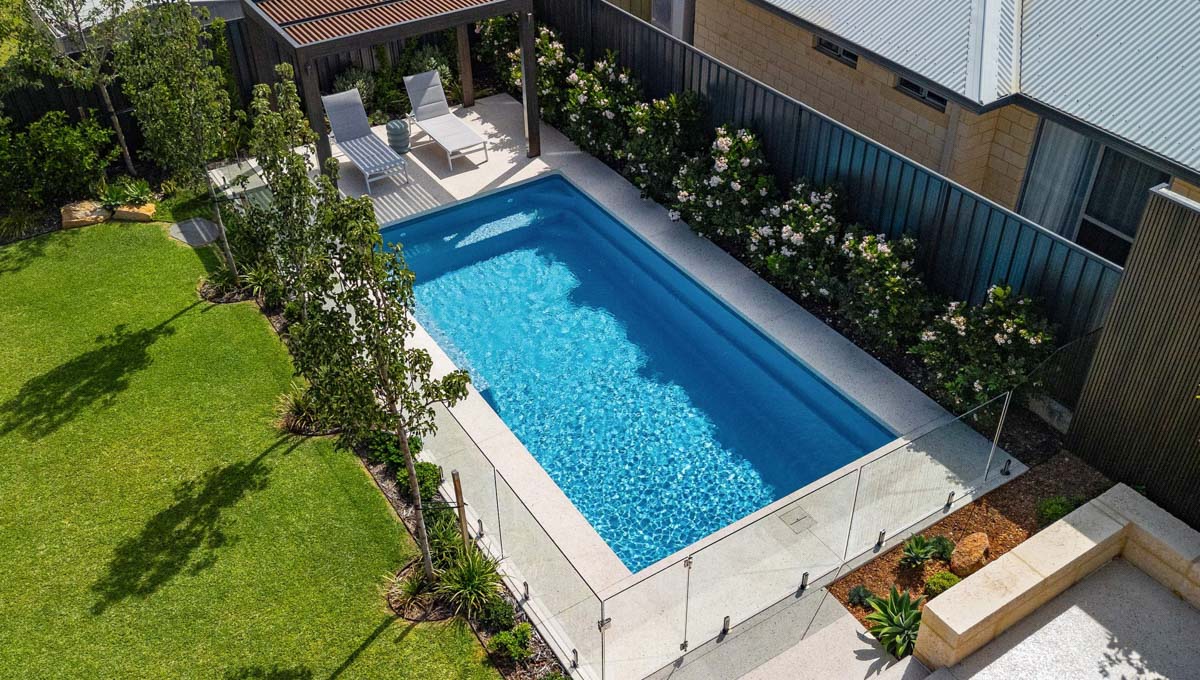 This spacious 10.1m x 4.4m Brampton pool in Beach Shimmer is the perfect centrepiece for this West Swan backyard. With its generous width and clean,