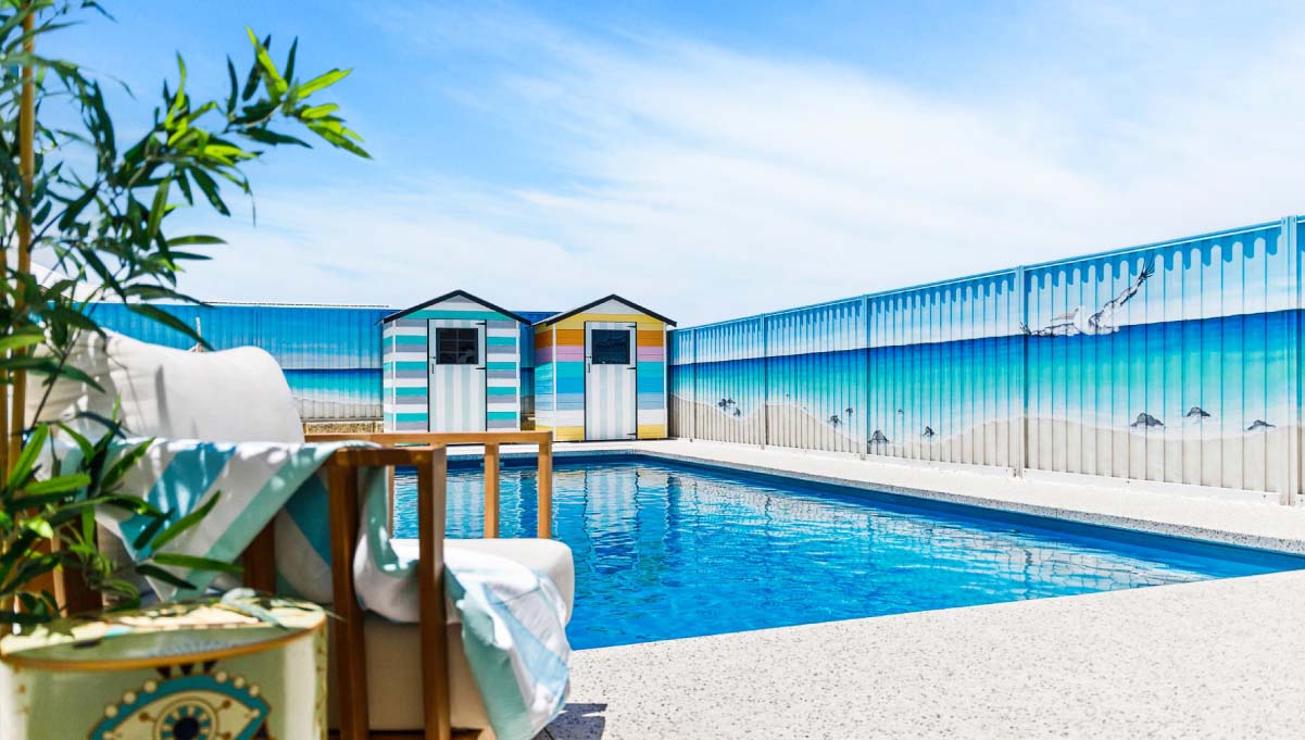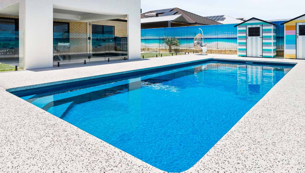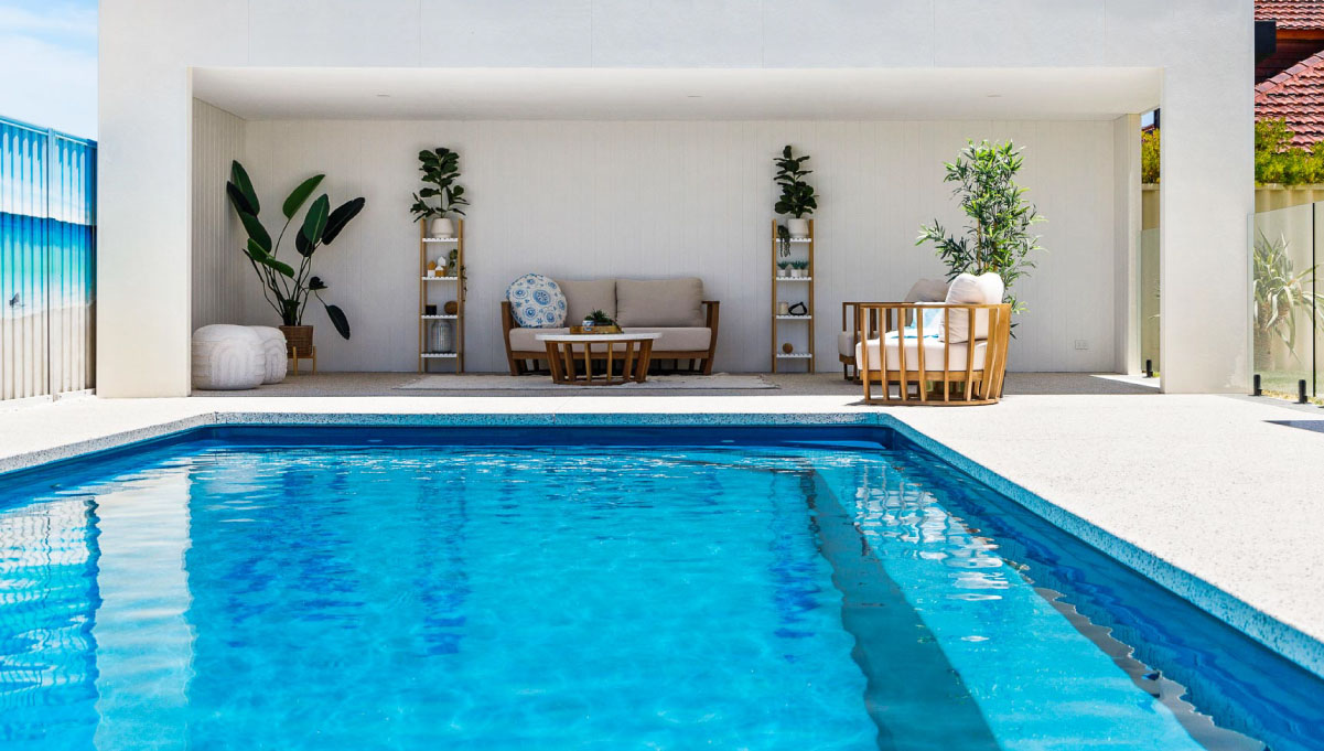 Introducing the Brampton 10.1m x 4.4m pool in Royal Ocean Shimmer, showcasing striking geometric features that beautifully complement both modern and timeless landscapes.