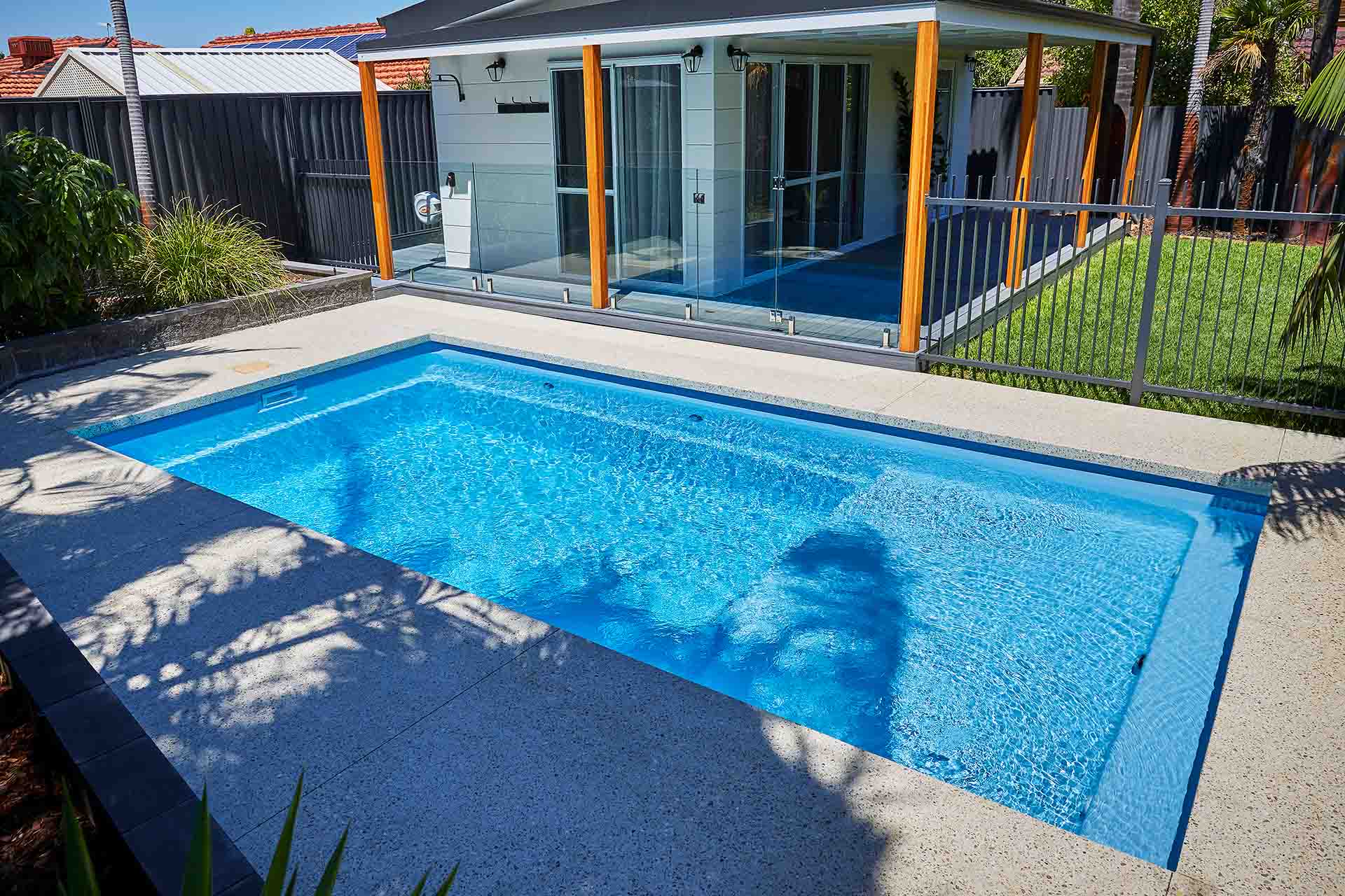 Like all Barrier Reef Pool designs, the Sunseeker Simline prioritises safety with a dedicated safety ledge for young swimmers, non-slip benches and steps, and smooth edges.